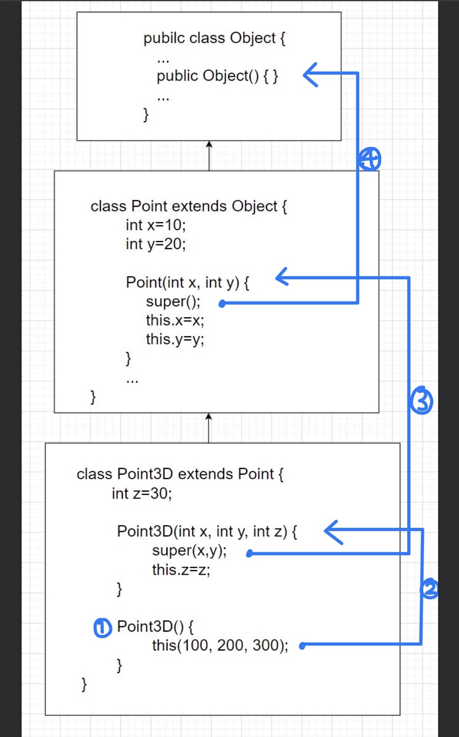 어떤 클래스의 인스턴스를 생성하면, 클래스의 상속관계의 최고조상인 Object클래스까지 거슬러 올라가면서 모든 조상 클래스의 생성자가 순서대로 호출됩니다. 거슬러 올라가는 모습을 그림으로 표현해보겠습니다.
