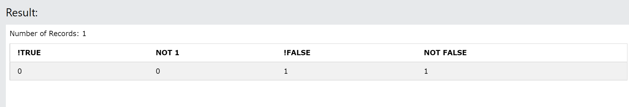 SELECT !TRUE, NOT 1, !FALSE, NOT FALSE;