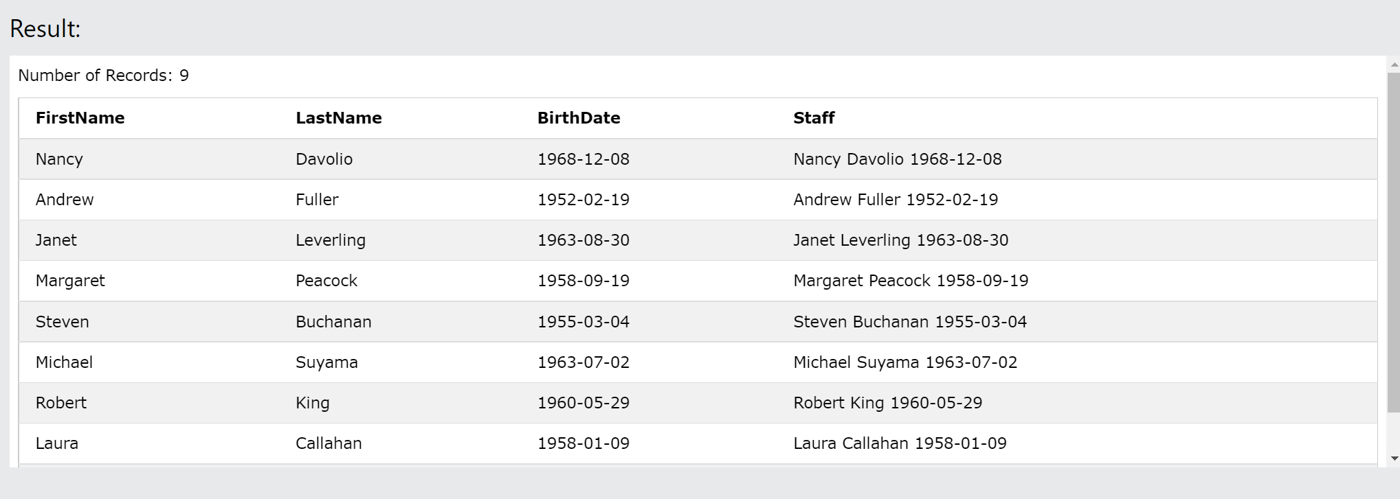 FirstName, LastName, BirthDate, CONCAT_WS(' ', FirstName, LastName, BirthDate) AS Staff