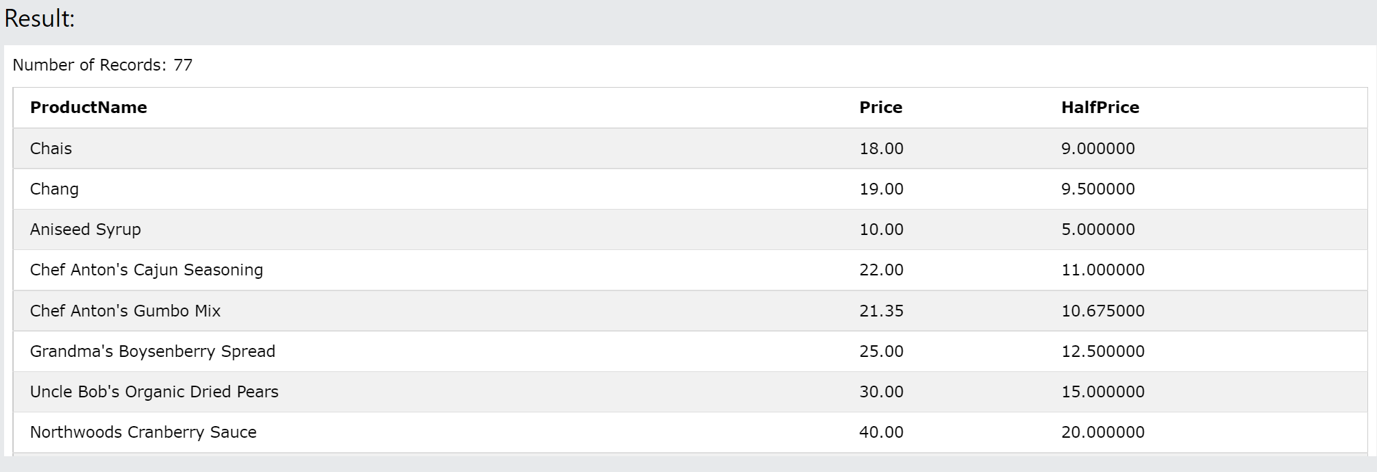 Price / 2 AS HalfPrice