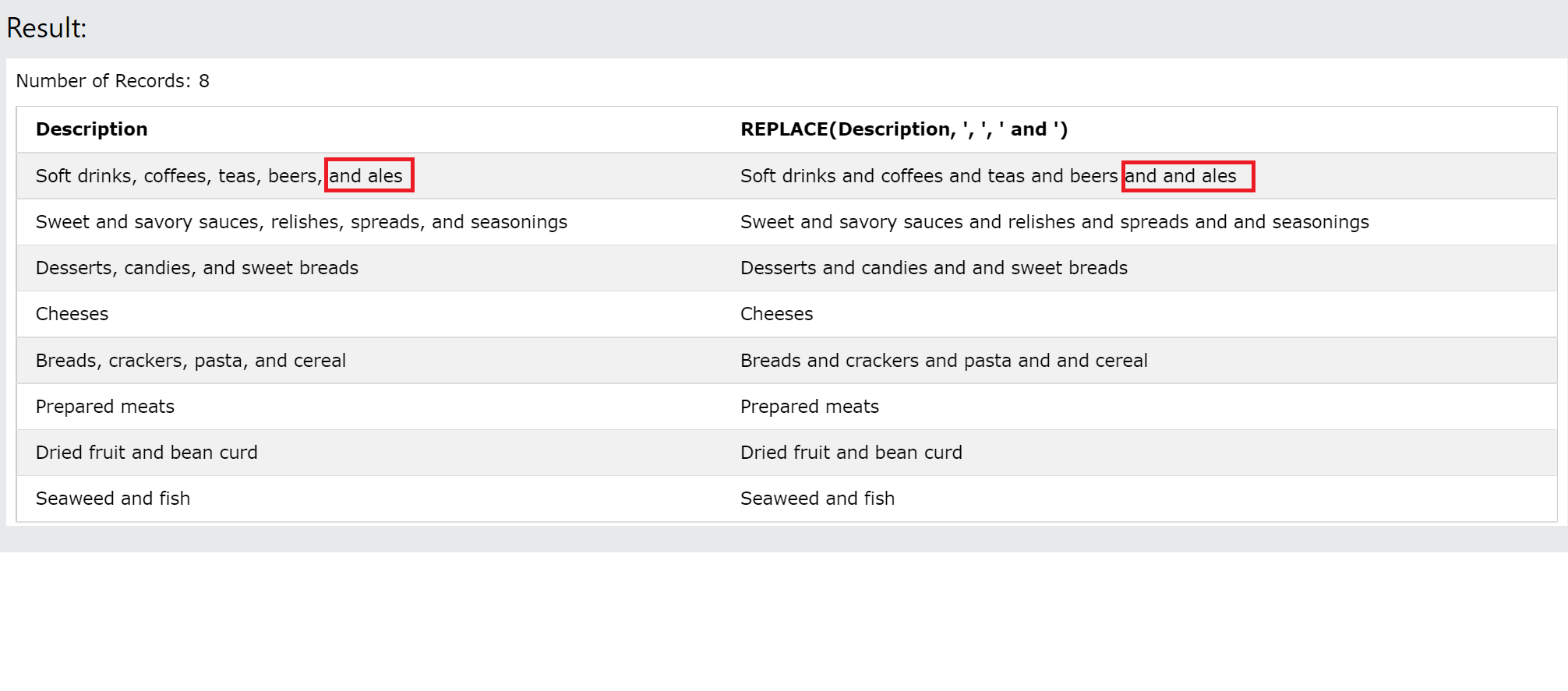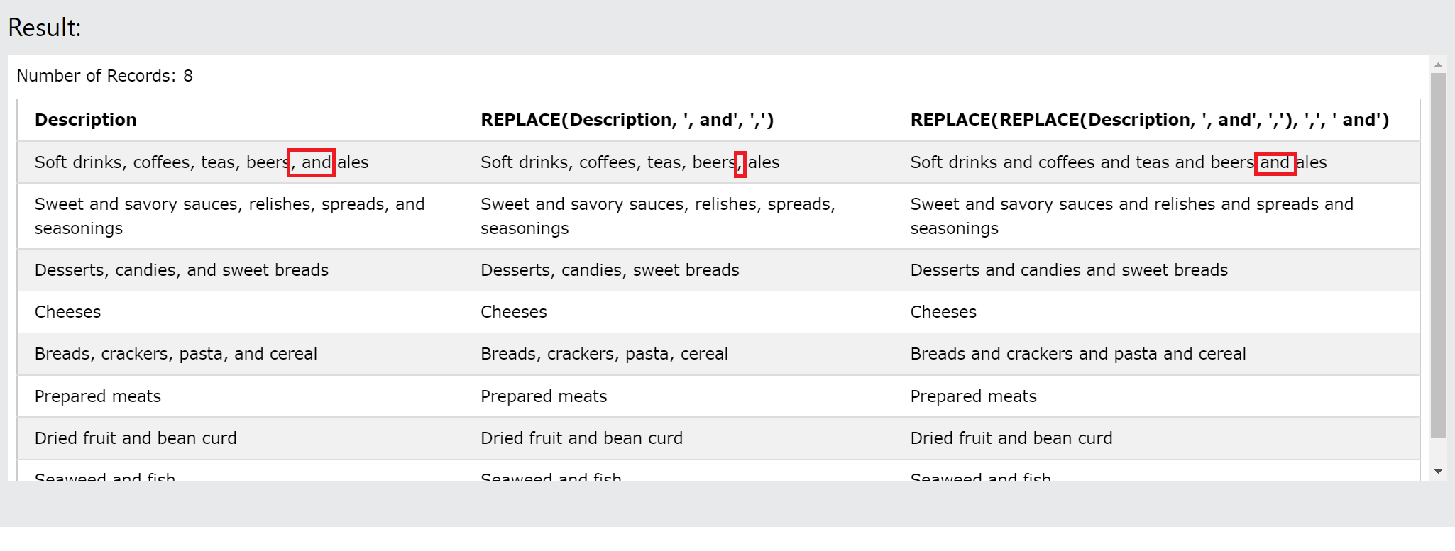 REPLACE(Description, ', and', ','),