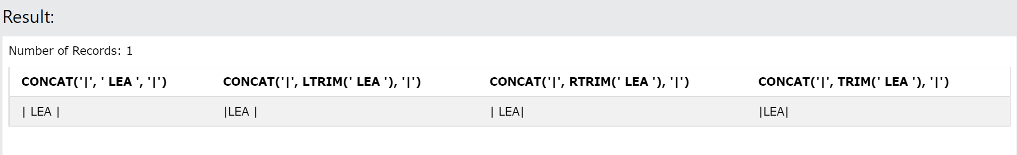 CONCAT('|', LTRIM(' LEA '), '|'),
