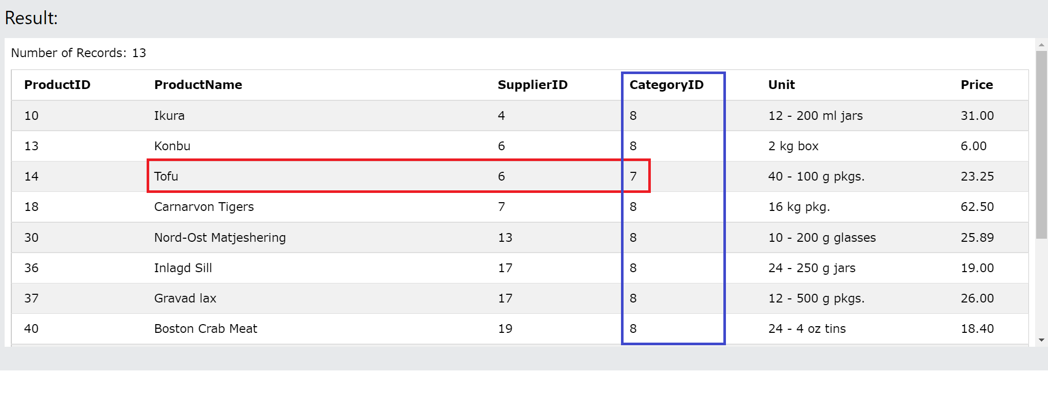 WHERE TRUNCATE(Price, 0) = 17;