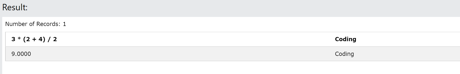 SELECT 3 * (2 + 4) / 2, 'Coding';