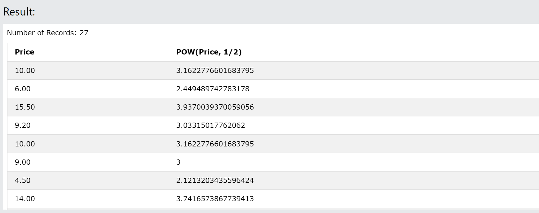 SELECT Price, POW(Price, 1/2)