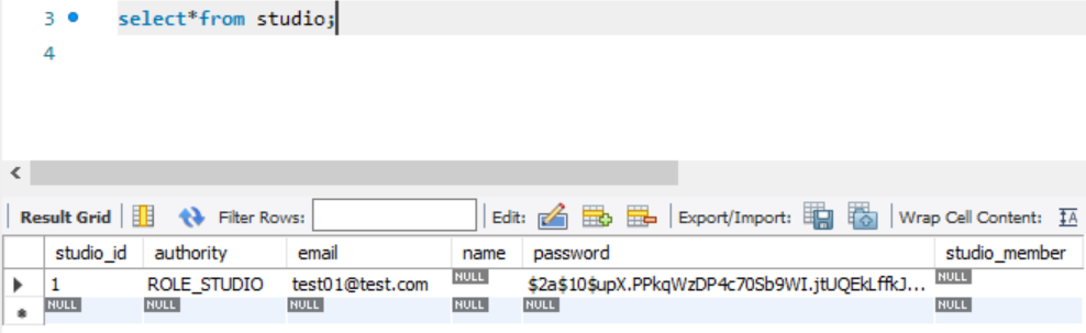 - 로그인 시 authenticate 메서드를 수행하면 DB에서 Studio정보를 조회해오는 loadUserByUsername 메소드가 실행됩니다.