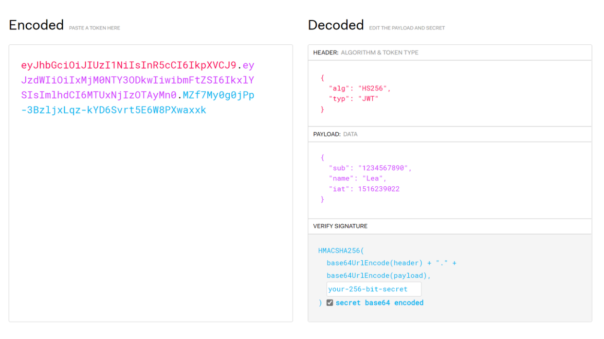 Signature : Token의 유효성 검증을 위한 암호화된 문자열입니다. 이 문자열을 통해 서버에서는 유효한 Token인지를 검증 할 수 있습니다.