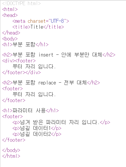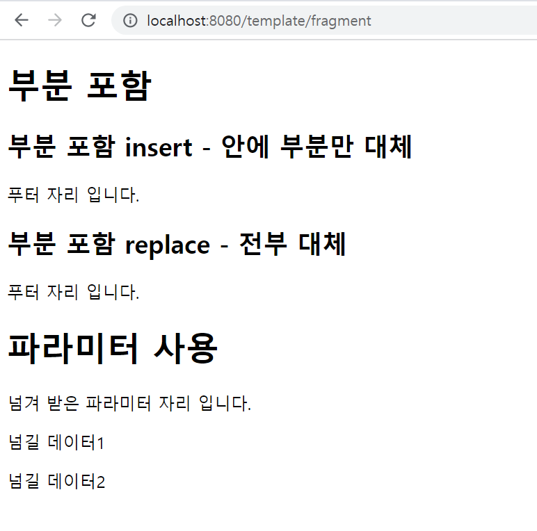 <div th:replace="~{template/fragment/footer :: copyParam ('넘길 데이터1', '넘길 데이터2')}"></div>
