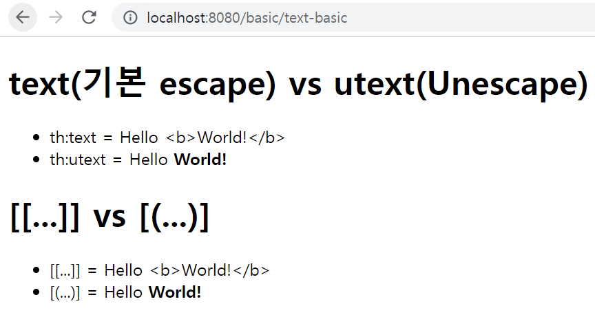 HTML의 콘텐츠(content)에 데이터를 출력할 때는 다음과 같이 th:text 를 사용하면 됩니다.