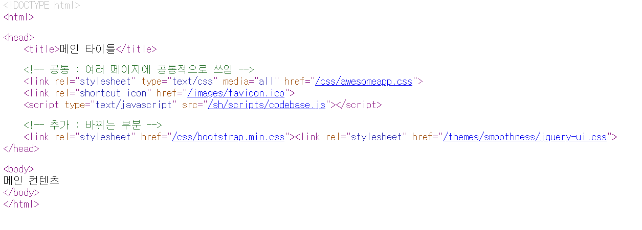 예를 들자면, 공통으로 사용하는 css , javascript 같은 정보는 한 곳에 모아둬서 여러 페이지에 공통으로 사용하고,