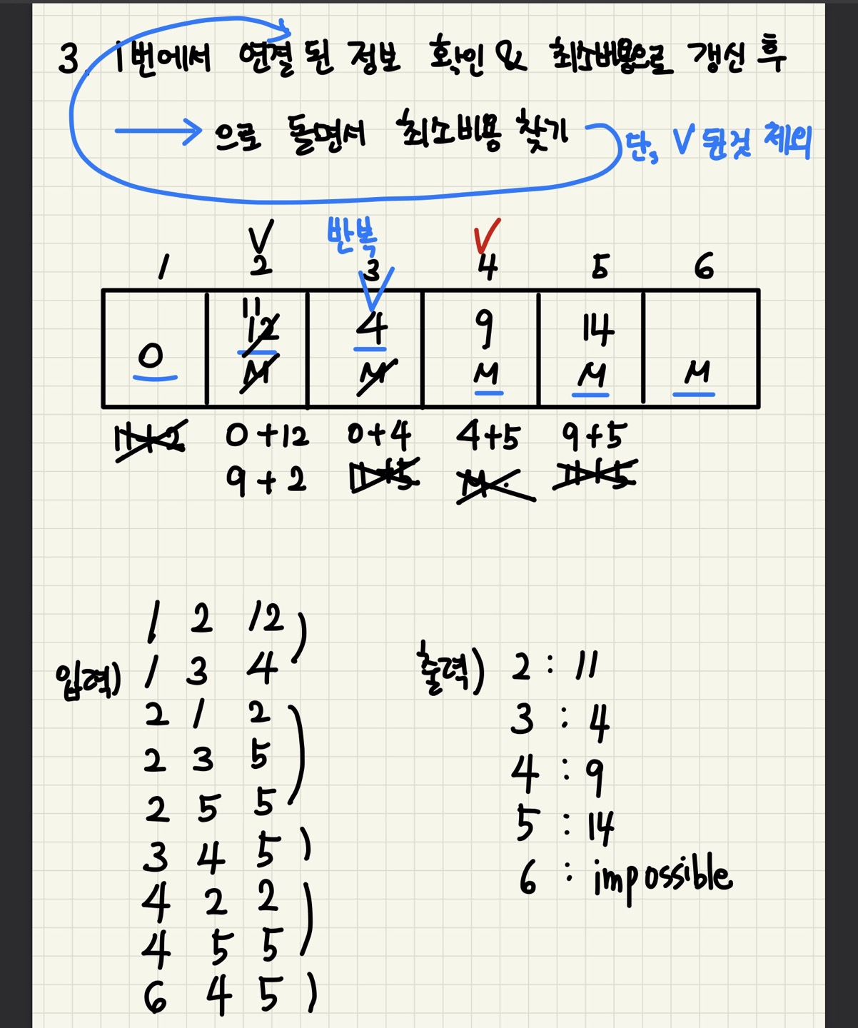 아래의 가중치 방향그래프에서 1번 정점에서 모든 정점으로의 최소 거리비용을 출력하는 프로 그램을 작성하세요. (경로가 없으면 Impossible를 출력한다)