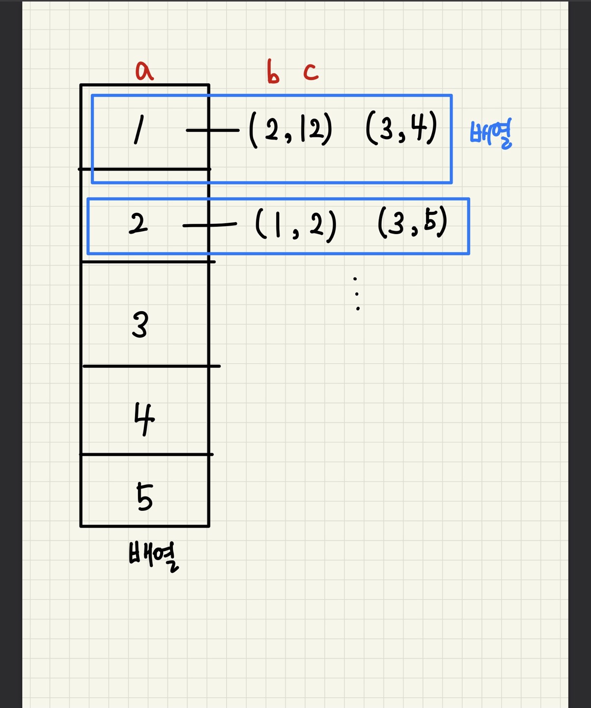 a배열을 우선 만들고 a배열에 해당하는 b,c배열을 만들어서 넣는 것