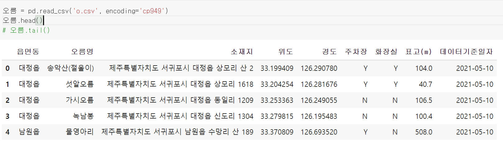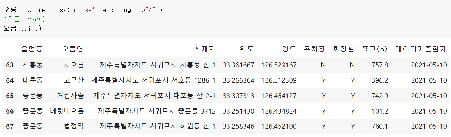 여기서 우리가 필요한 데이터는 오름명, 위도, 경도의 데이터이므로