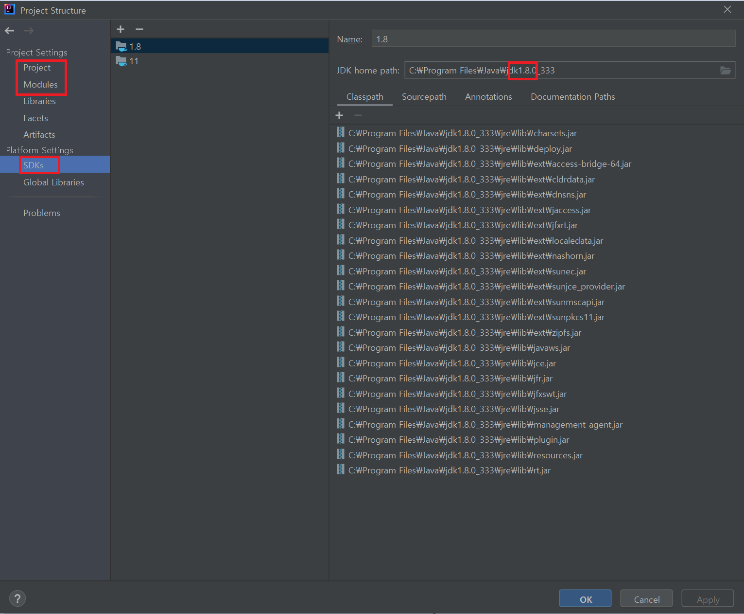 2. Project Structure → Project, Modules, SDKs에 나의 Java 버전으로 변경