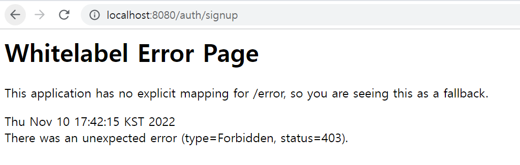 여기까지 작성하고 구동을 해보면 403 에러가 뜨는 것을 볼 수 있었습니다.