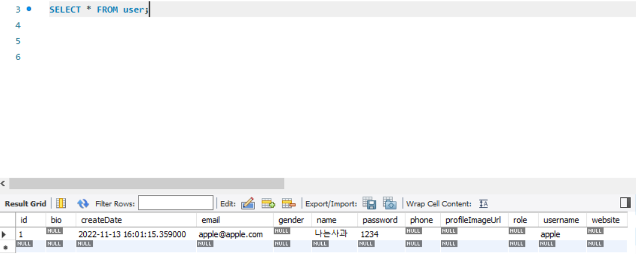 우선 회원가입은 잘 되지만 아직은 password 암호화가 안된 상태로 DB에 INSERT 된 상태입니다.
