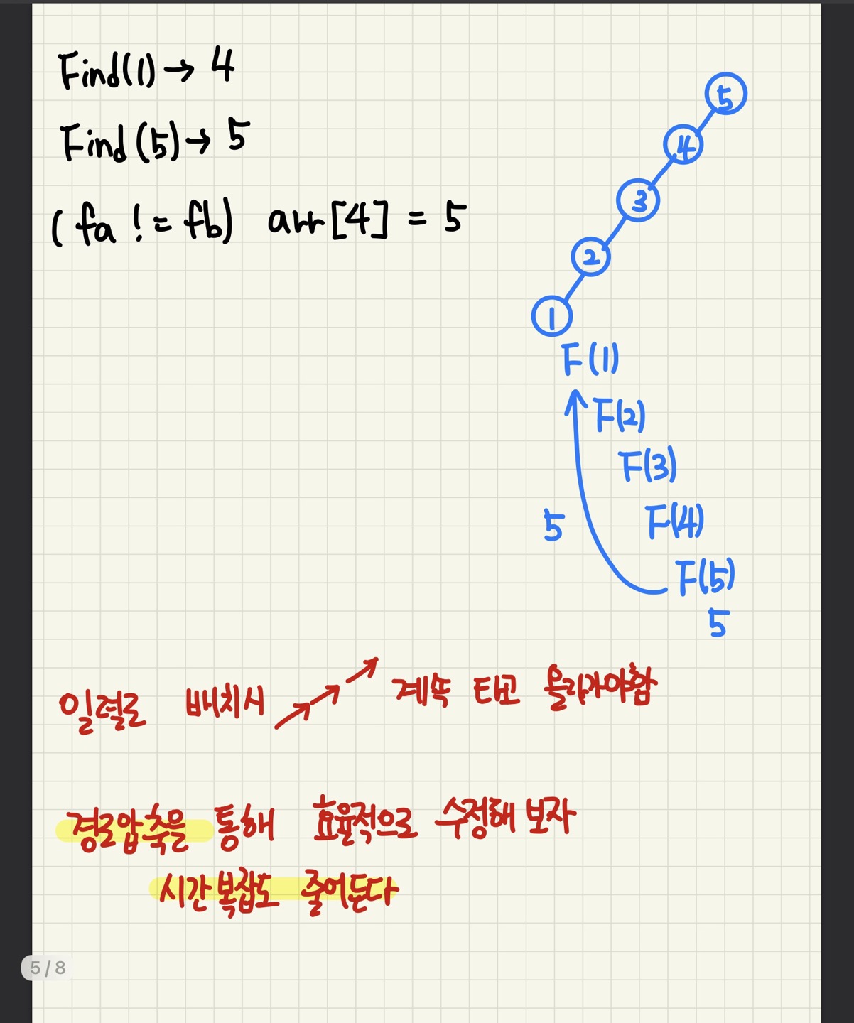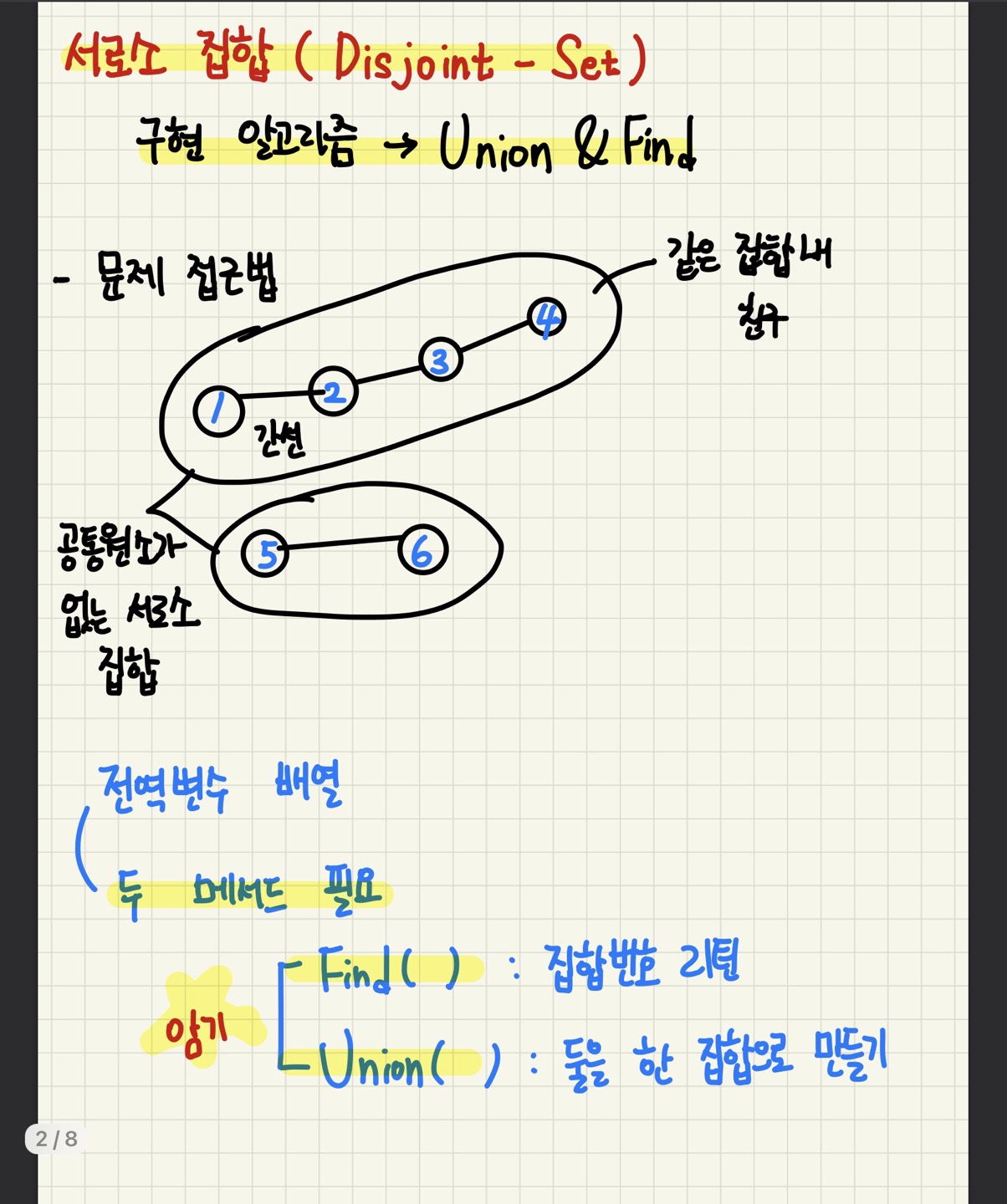 선생님께서는 서로소집합을 통해서 문제를 해결하셨고 그때 Union&Find알고리즘을 통해 구현하셨습니다.