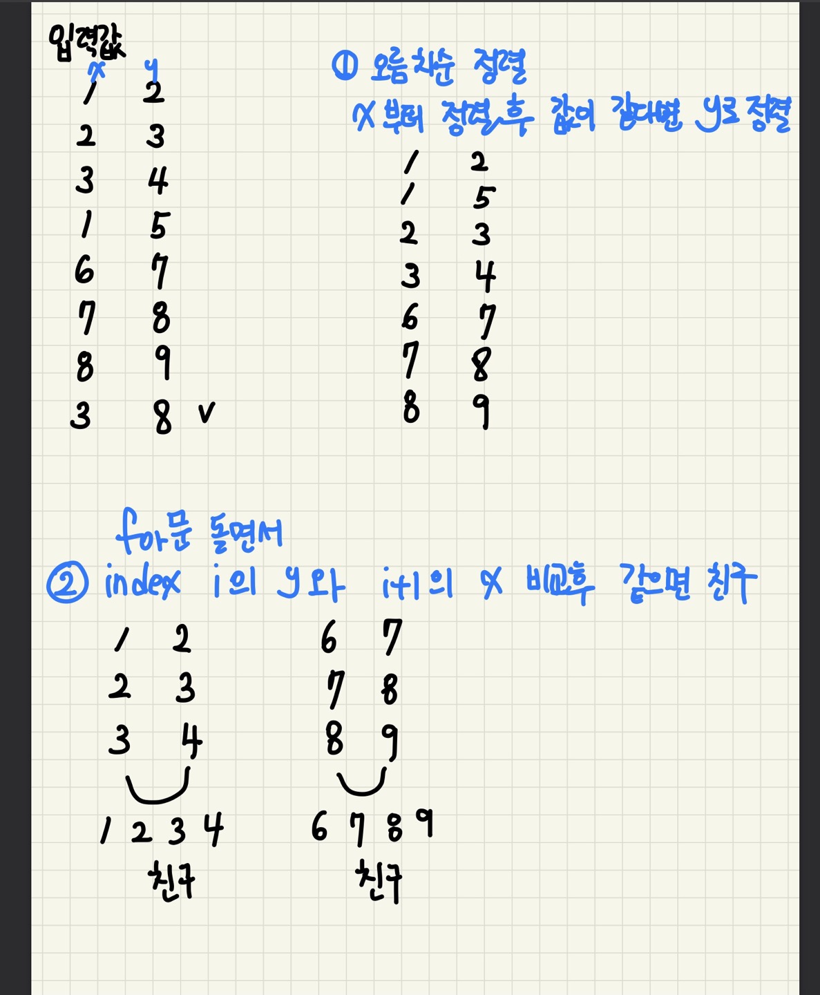 만약 (1, 2), (2, 3), (3, 4)의 숫자쌍이 주어지면 1번 학생과 2번 학생이 친구이고, 2번 학생과 3번 학생이 친구, 3번 학생과 4번 학생이 친구이다.