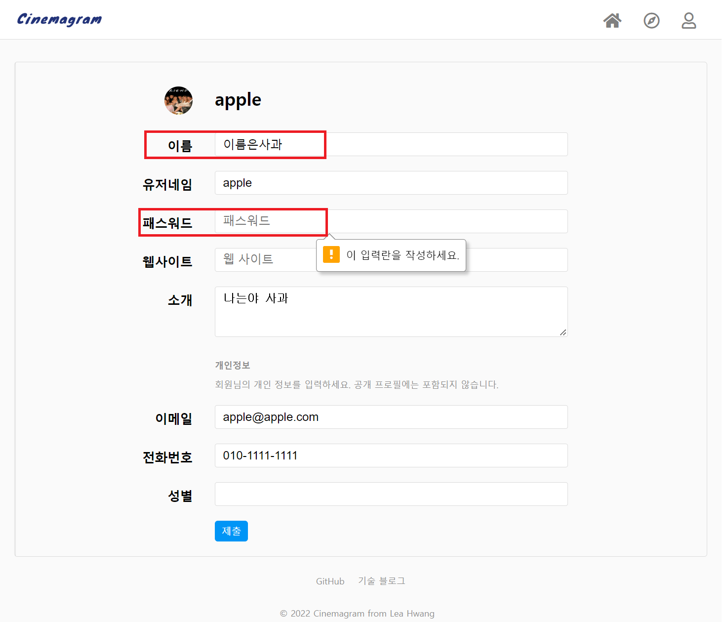 다른 필드와 달리 name, password는 필수로 입력이 들어가야 합니다. 따라서 Validation체크가 들어가야합니다.