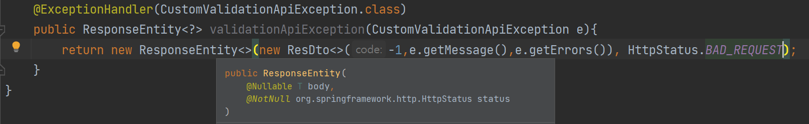 return new ResponseEntity<>(new ResDto<>(-1,e.getMessage(),e.getErrors()), HttpStatus.BAD_REQUEST);