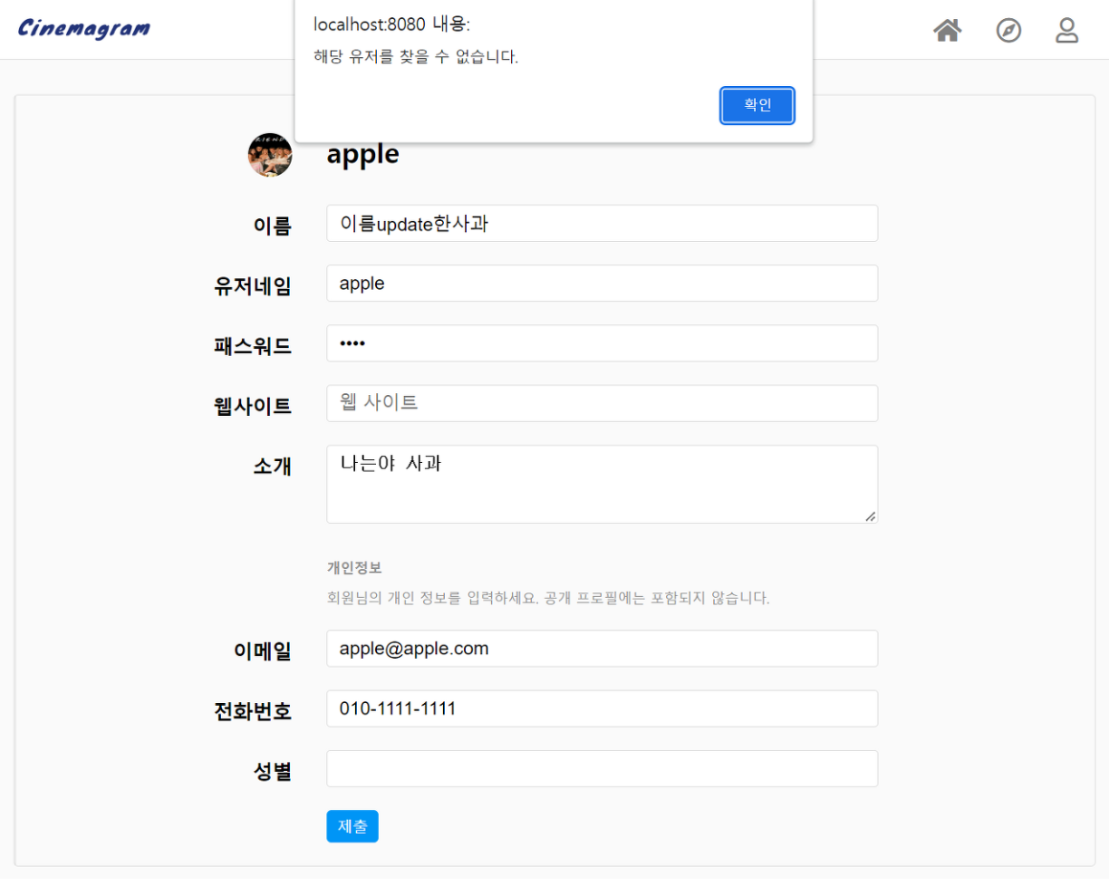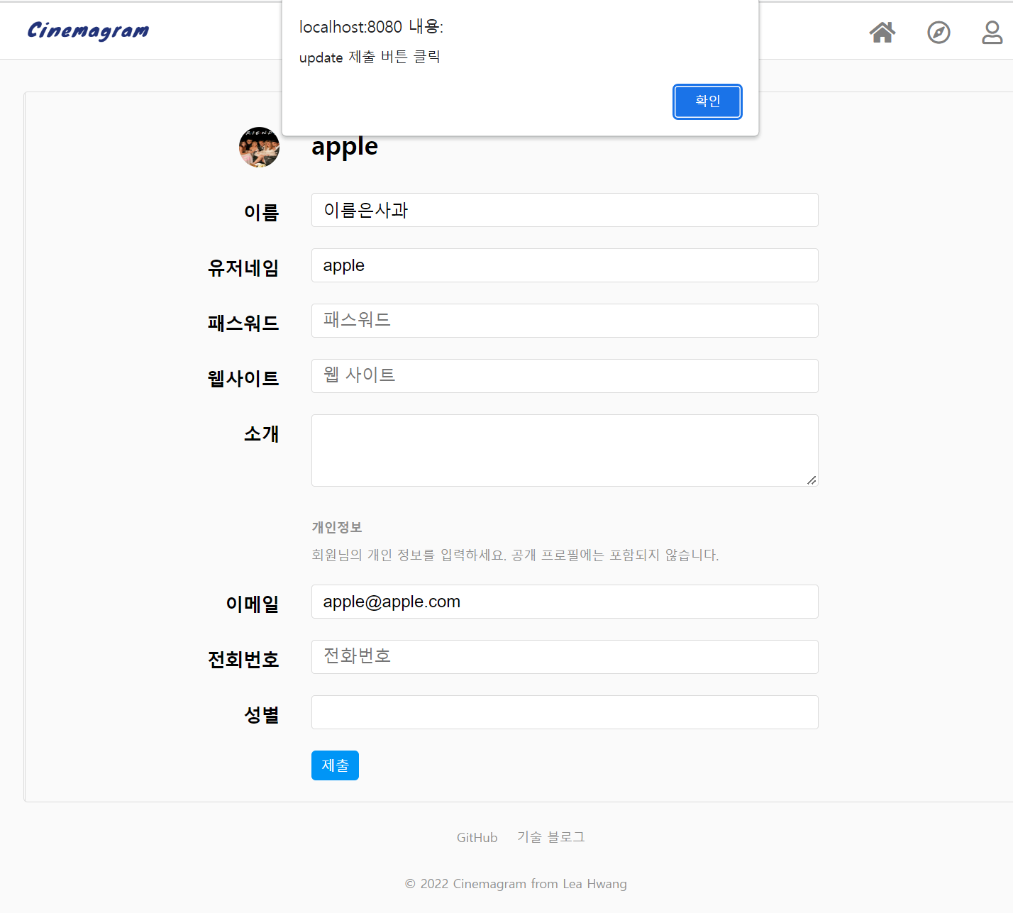 회원정보 변경 버튼 클릭 시 나오는 화면입니다. input 정보는 update.html valule에 적어둔 내용입니다.