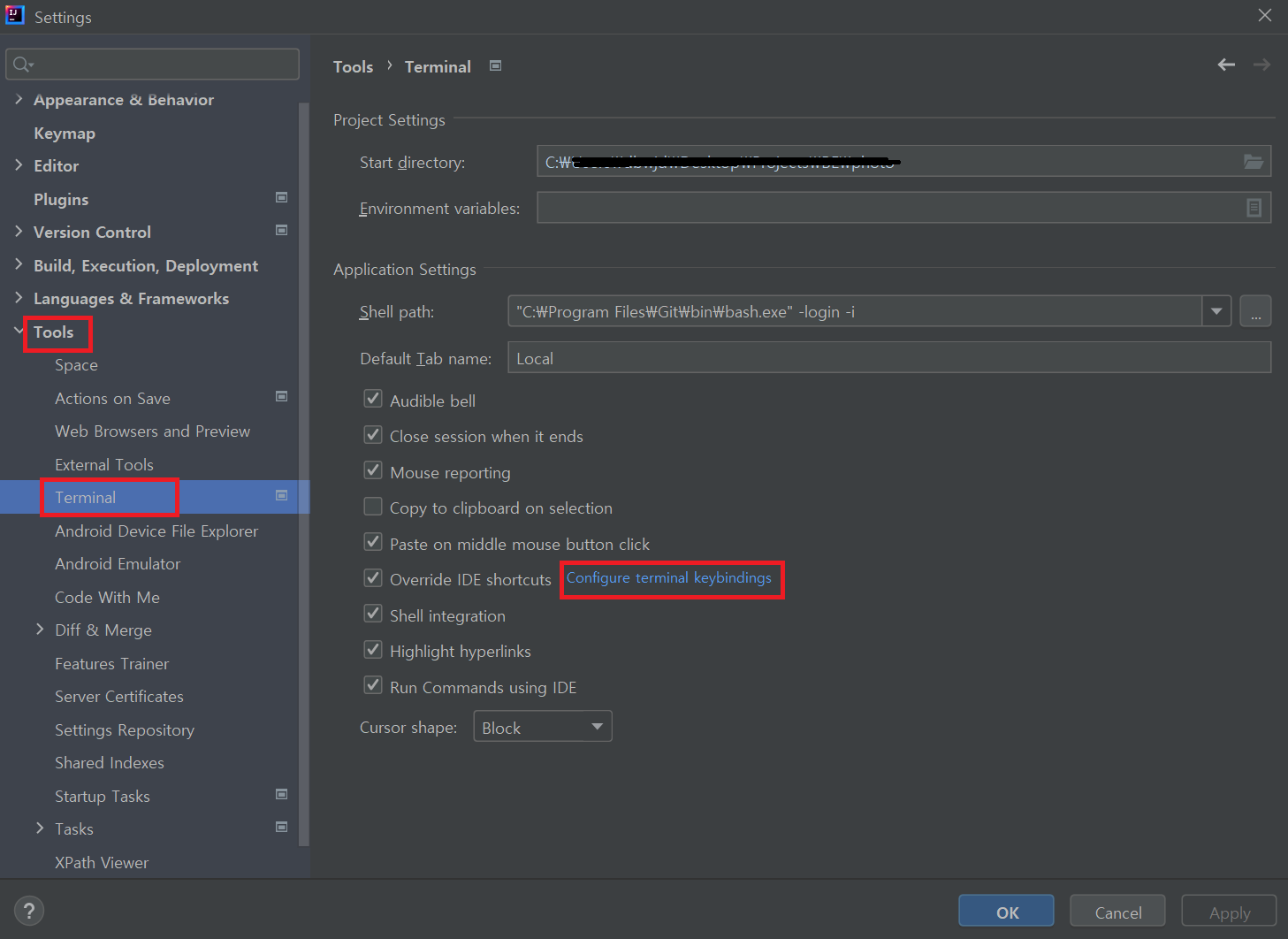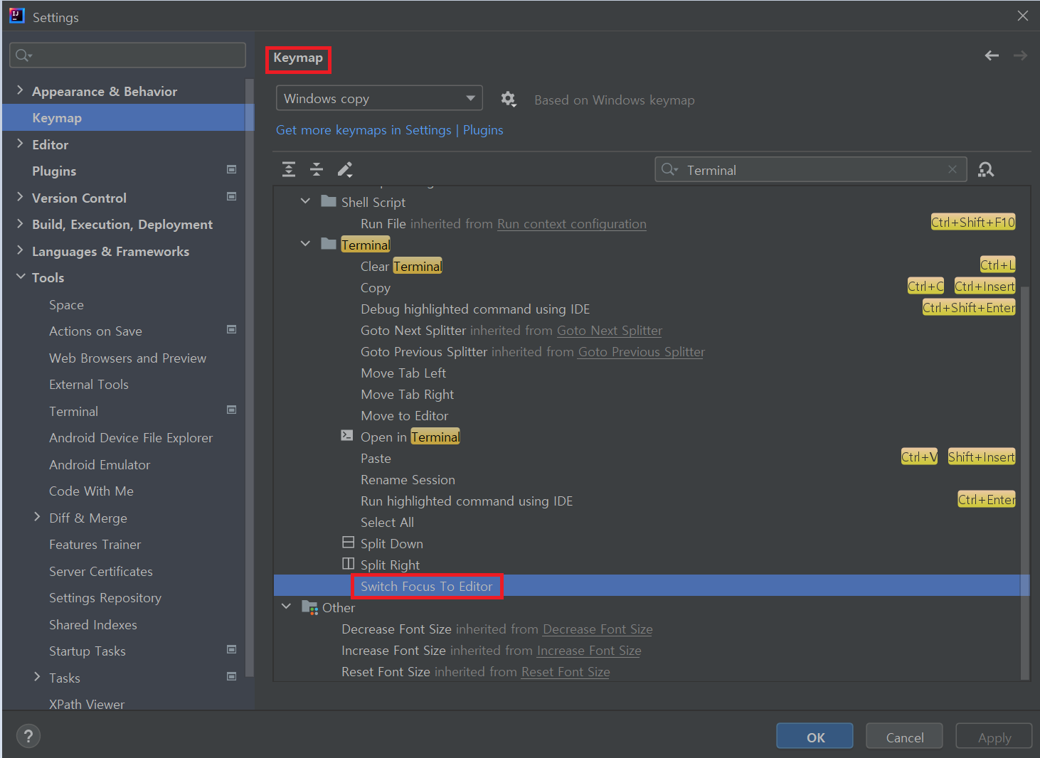 File > Settings > Tools > Terminal에 들어가서 Configure terminal keybindings를 클릭하면 Keymap으로 넘어가는데