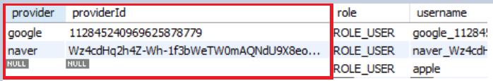 그럼 일반 사용자는 해당 필드에 null이 소셜 로그인 사용자는 값이 채워지는 것을 확인할 수 있습니다.
