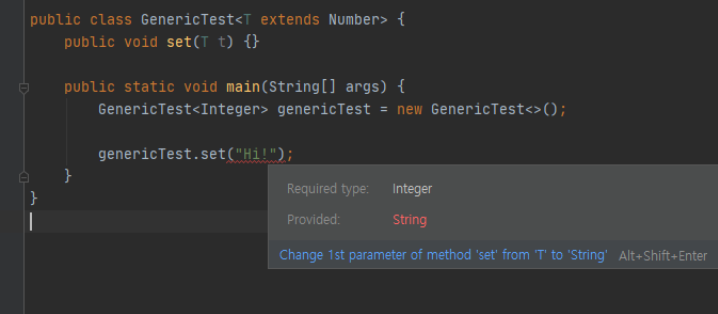 GenericTest 클래스의 Type 파라미터를 T로 선언하고 <T extends Number >로 선언한다.