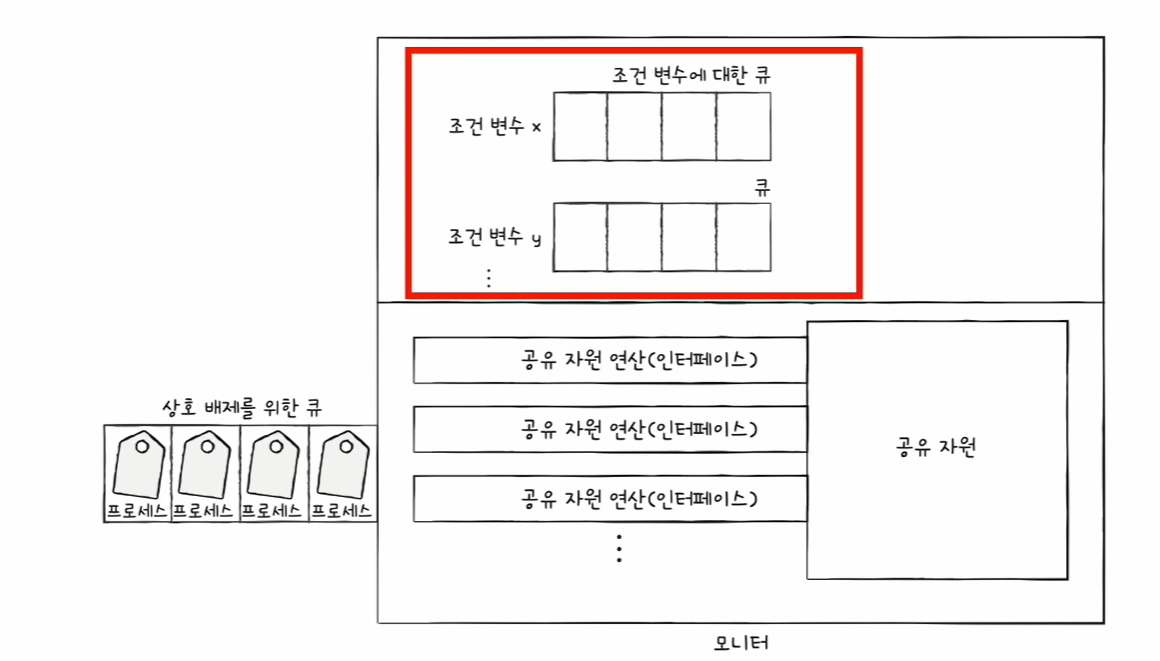 - 모니터는 공유 자원과 자원에 접근하기 위한 인터페이스를 묶어 관리합니다. 프로세스는 반드시 인터페이스를 통해 공유 자원에 접근할 수 있습니다. 인터페이스에 접근하기 위한 큐를 이용해 하나의 프로세스만 들어오도록 합니다.