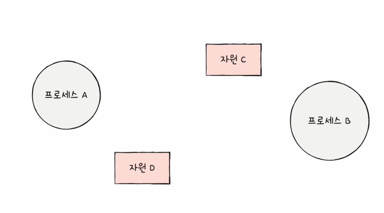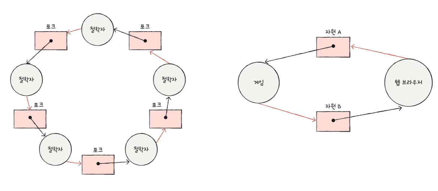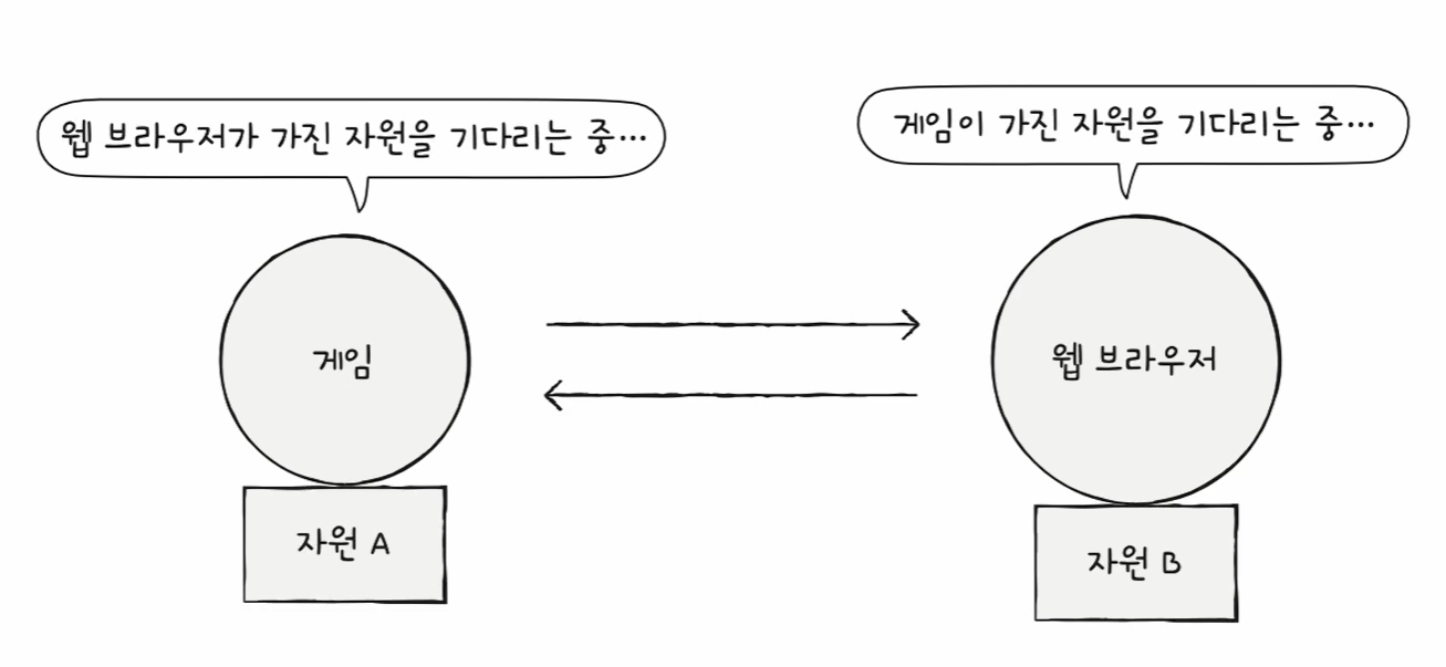 둘 이상의 프로세스가 다른 프로세스가 점유하고 있는 자원을 서로 기다릴 때 무한 대기에 빠지는 상황을 일컫습니다. 교착상태를 해결하는 것도 운영체제의 중요한 역할입니다.