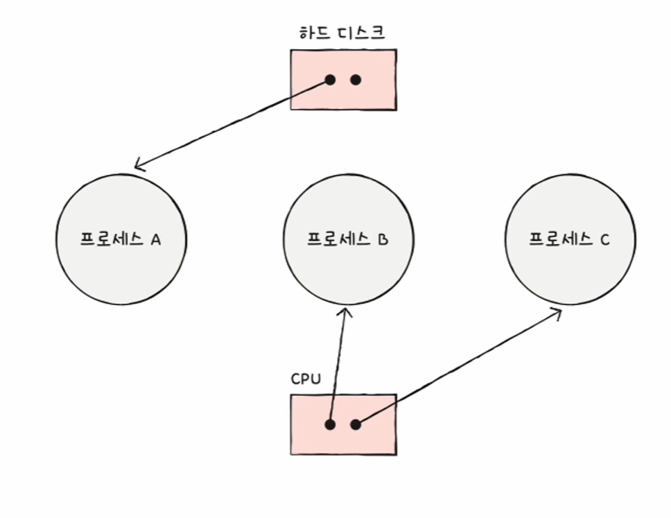 셋째, 프로세스가 어떤 자원을 할당 받아 사용 중이라면 자원에서 프로세스를 향해 화살표를 표시합니다.