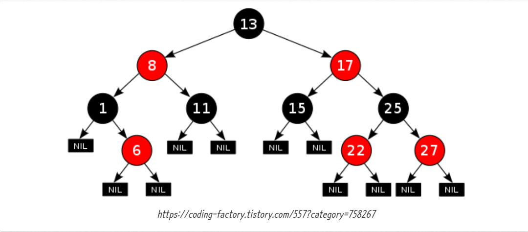 - 레드 노드의 자식 노드는 모두 블랙이다.