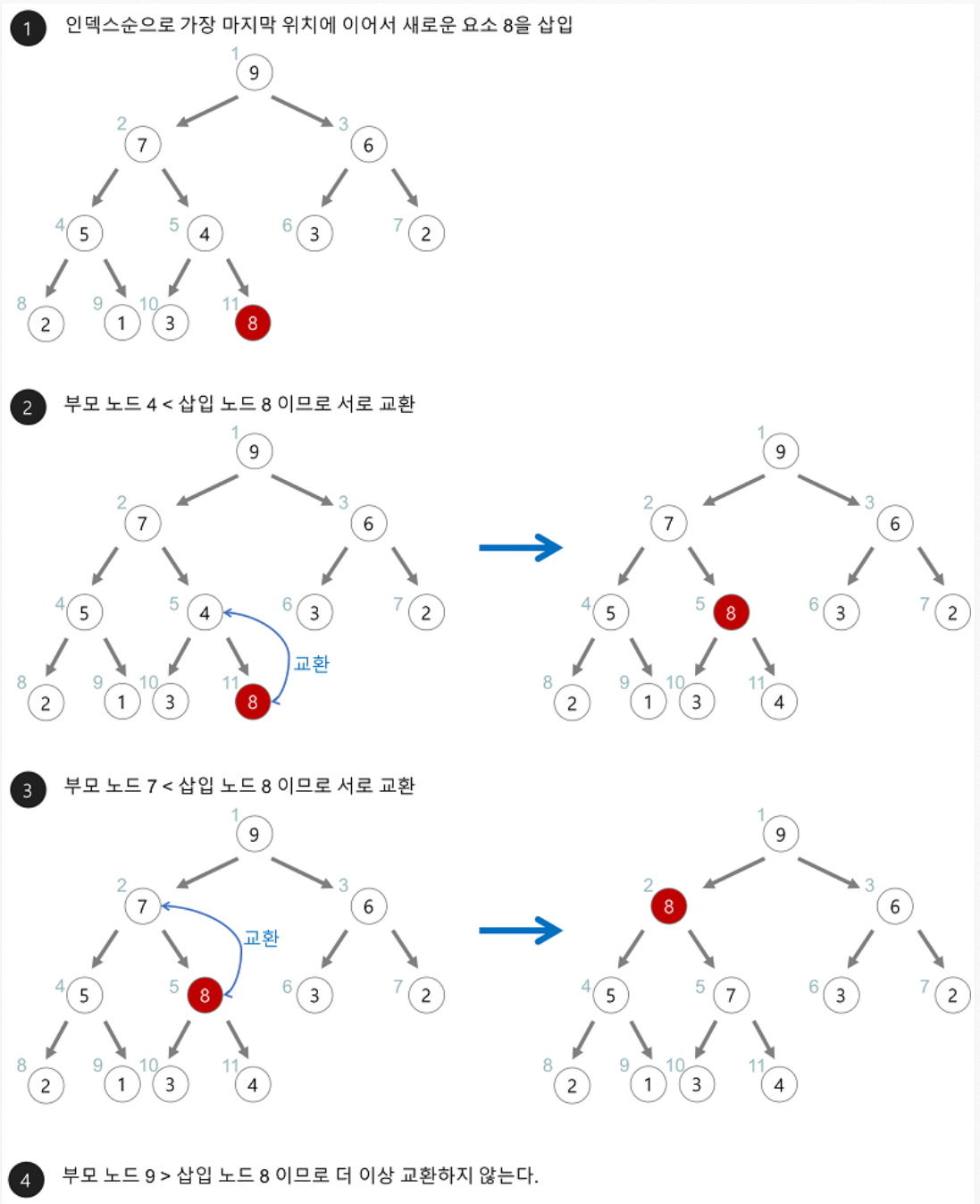 - n개의 노드에 대한 완전 이진트리를 구성하고 최대 힙을 구성한다.