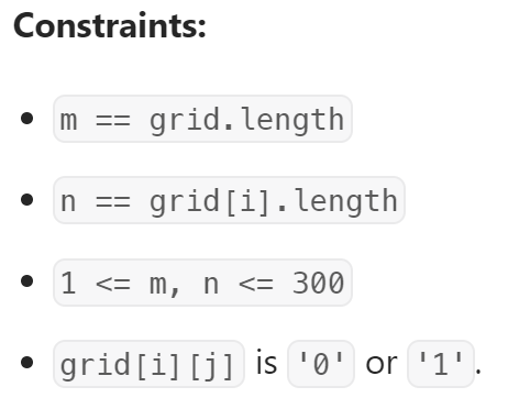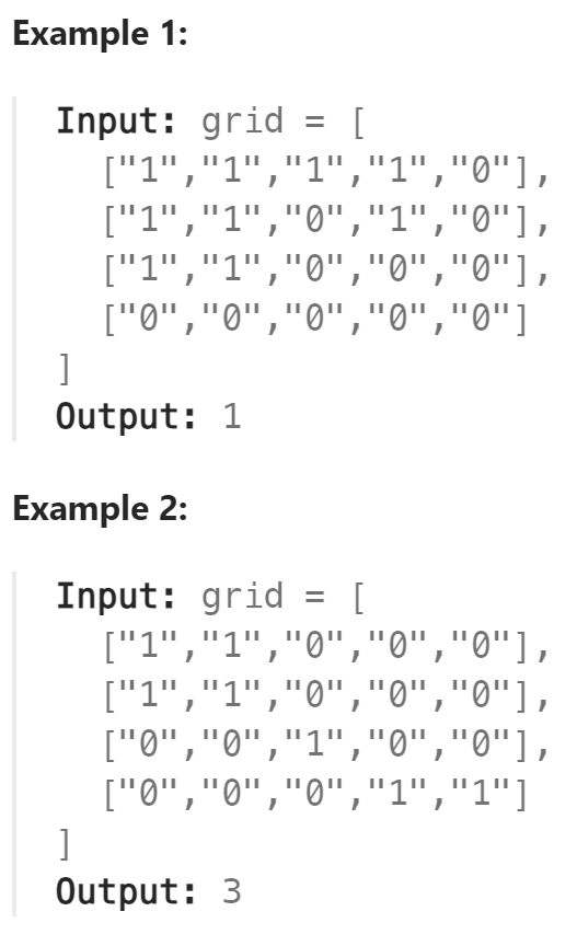 m x n 2D 이진 그리드 grid가 '1'(육지)과 '0'(물)의 지도를 나타냅니다. 섬의 개수를 반환하세요.