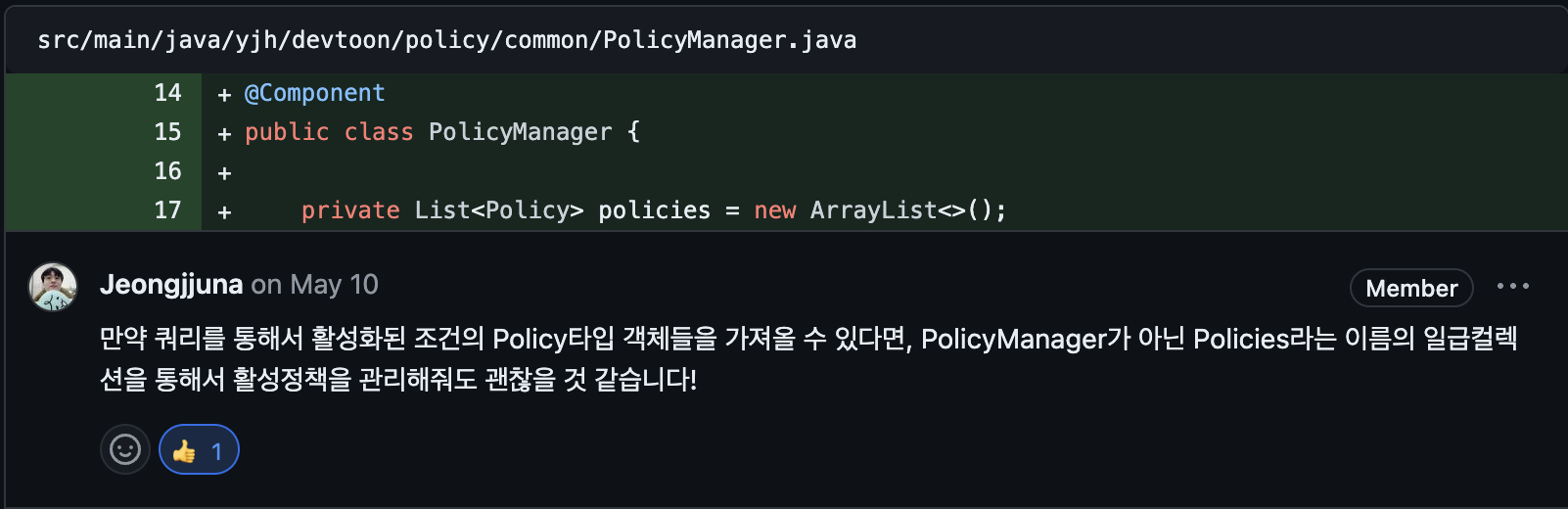 코드 리뷰 중에 '현재 적용가능한 정책들을 모아두는 리스트를 일급 컬렉션을 사용해서 구현해 볼 수도 있지 않을까요?'라는 리뷰 또한 받았었다. 컬렉션을 하나의 객체로 취급해 해당 클래스에서 관련된 모든 작업을 책임지도록 하면 코드 결합도도 낮출 수 있고 코드 가독성 또한 좋아질 것 같아 추가적으로 리팩토링을 진행한다면 도전해보고 싶다.