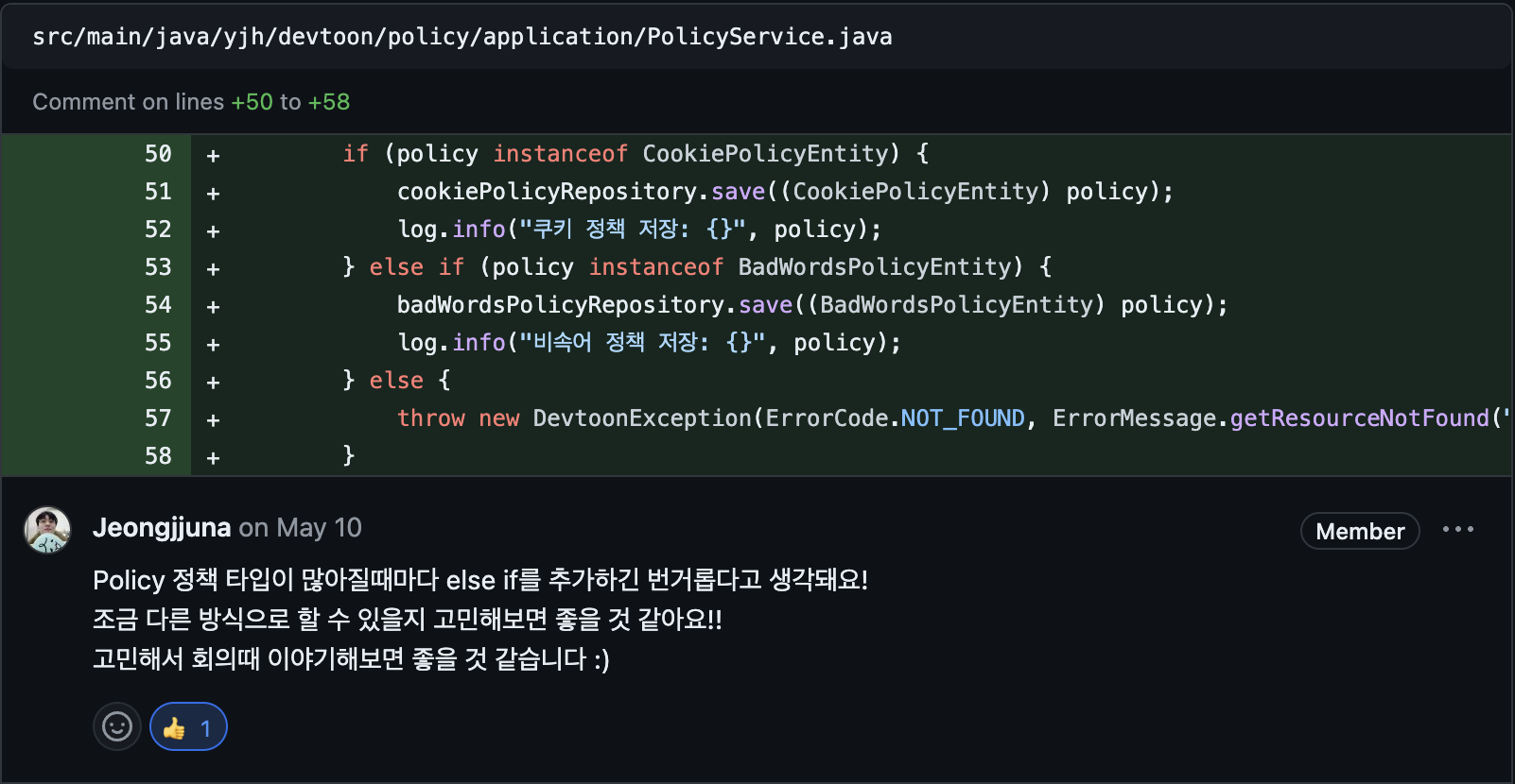 • 단점: 새로운 Policy 타입 정책이 추가될 때마다 if-else 또는 switch 문을 수정해야 함.