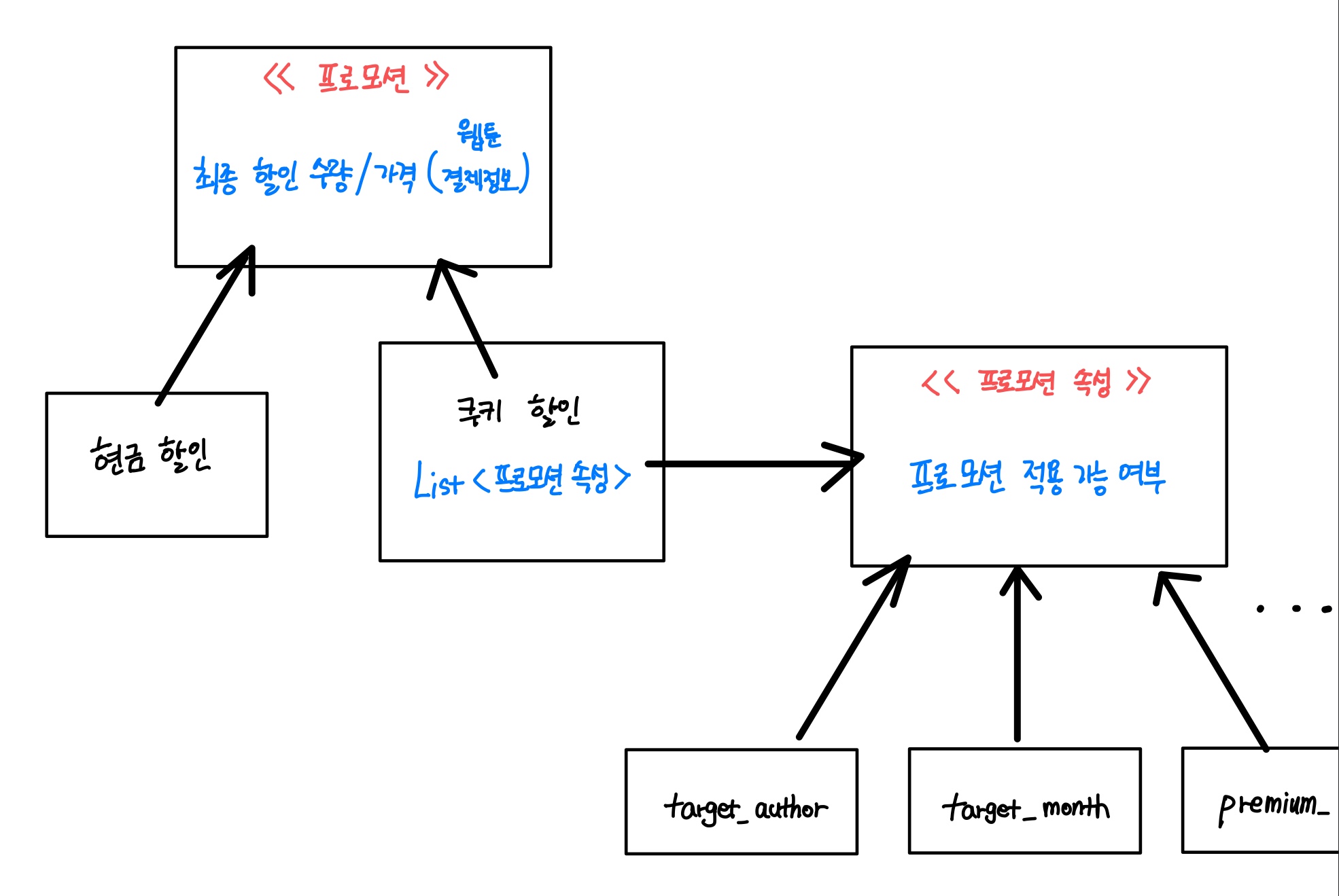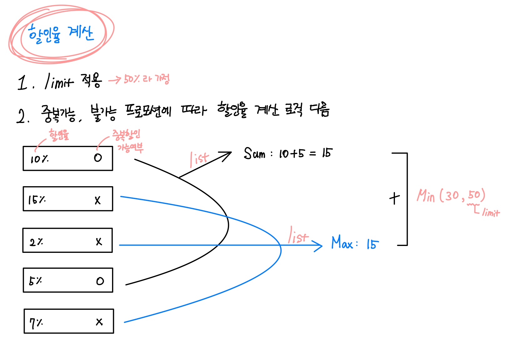 🔥 한 프로모션 내 여러 속성 중 하나라도 할인 대상이 되면 프로모션 할인율이 단 1번 적용된다. 프로모션 별 중복 할인 가능 여부에 따라 할인율 로직을 다르게 가져갈 생각이다. 생각해 본 것을 그림으로 나타내보면 다음과 같다.