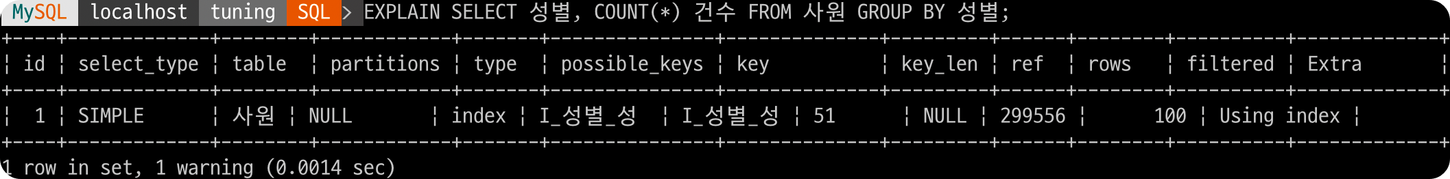 key항목이 I_성별_성 인덱스로 인덱스 풀 스캔 방식으로 수행되며, Extra항목이 Using index로 임시 테이블 없이 인덱스만 사용하는 것을 알 수 있다.