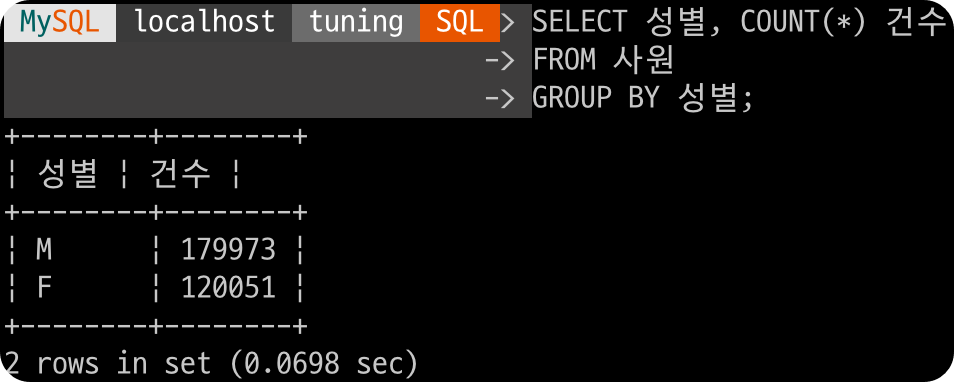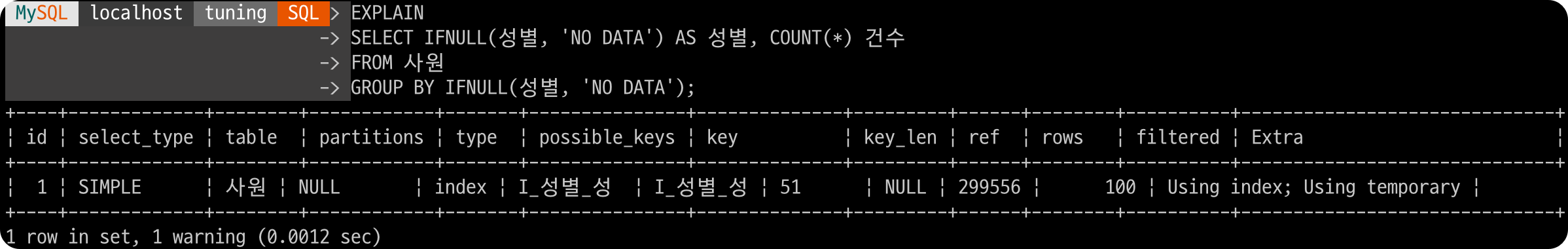 I_성별_성 인덱스로 인덱스 풀 스캔 방식을 수행하며, Extra 항목이 Using temporary로 임시 테이블을 생성한다는 것을 알 수 있다.