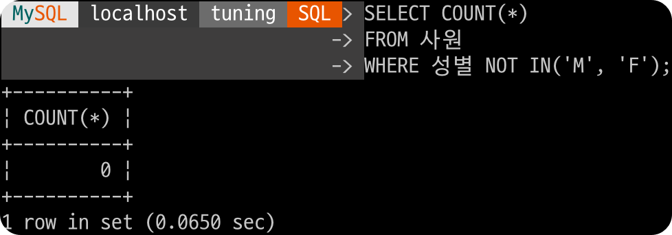 | 성별 | enum('M','F') | NO | MUL | NULL | |