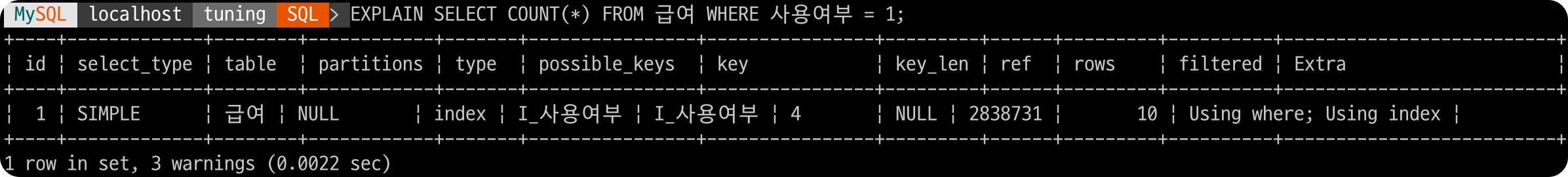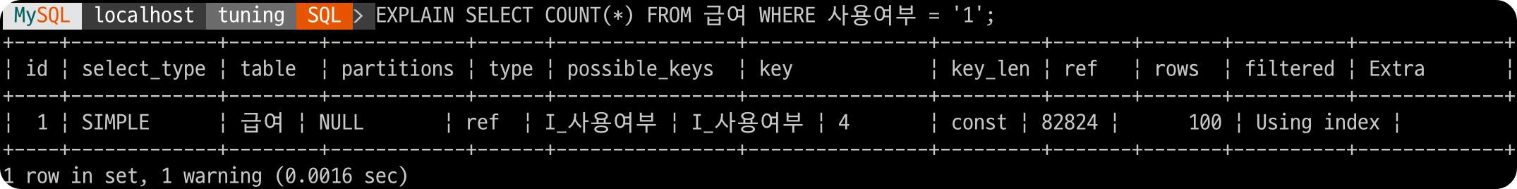 key 항목에서 I_사용여부 인덱스를 사용한다는 것을 알 수 있고, type 항목이 ref이므로 인덱스를 통해 특정 조건에 맞는 데이터를 효율적으로 가져온다. 또한, filtered 값이 100이므로 가져온 데이터가 모두 사용되는 것을 알 수 있다.