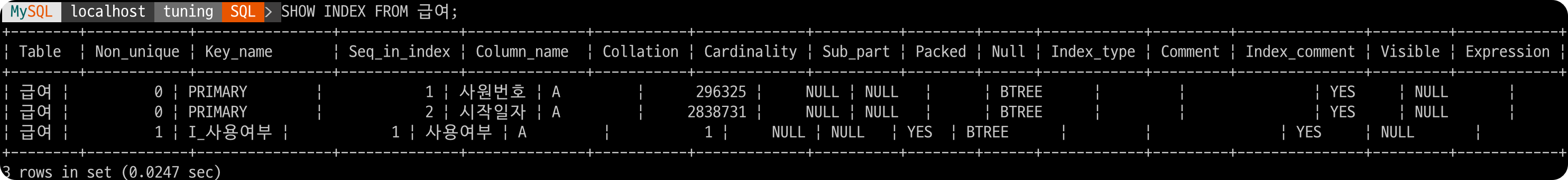 여기서는 어떤 문제가 있을까? 우선 급여 테이블의 인덱스 현황을 알아볼 필요가 있다.