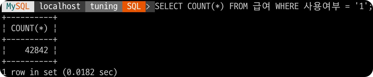 key항목이 I_사용여부로 출력되고, type항목이 index이므로 인덱스 풀 스캔 방식으로 테이블의 데이터를 찾고 있다. 그리고 filtered항목이 10이므로 MySQL엔진으로 가져온 데이터 중 10%를 추출해서 최종 데이터를 출력했다는 것을 알 수 있다.