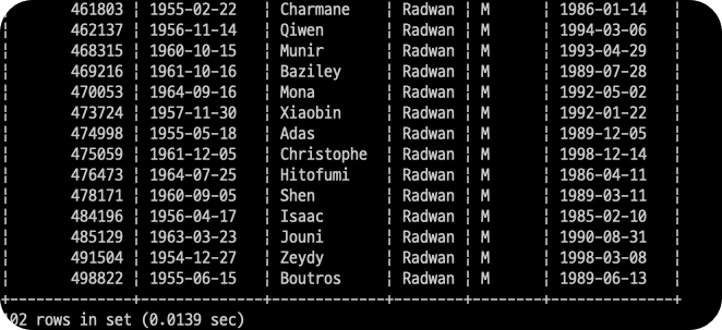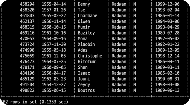 WHERE CONCAT(성별, ' ', 성) = 'M Radwan';