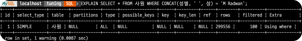 사원 테이블에만 접근하여 데이터를 가져오고 있다. 문제의 SQL문에서는 WHERE 조건절로 데이터에 접근하는 반면, 실행계획을 확인해 보니 type 항목이 ALL 테이블 풀 스캔을 하고 있다.