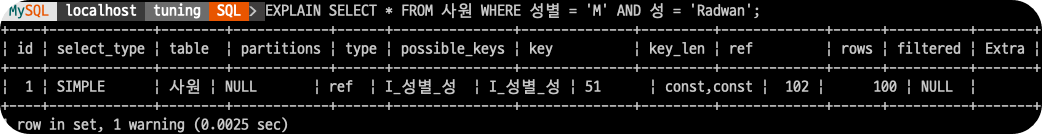 I_성별_성 인덱스를 사용해서 테이블에 접근하고 있고, 튜닝 전에는 약 30만 건의 데이터에 접근했다면 튜닝 후에는 102건의 데이터에만 접근한다는 것을 알 수 있다. 그리고 type유형이 ref로 인덱스를 이용해 특정 조건(주로 =)에 맞는 데이터를 찾고 있다.