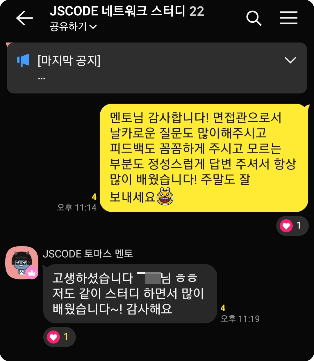 ps. 면접 스터디가 다 끝나고 현직자 분께 추후에 다른 스터디 할 생각 있으면 같이 하자고 제안도 받았고 멘토님께서도 많이 배운다고 말씀하셨다... 정말 어깨가 올라가는 포인트다.