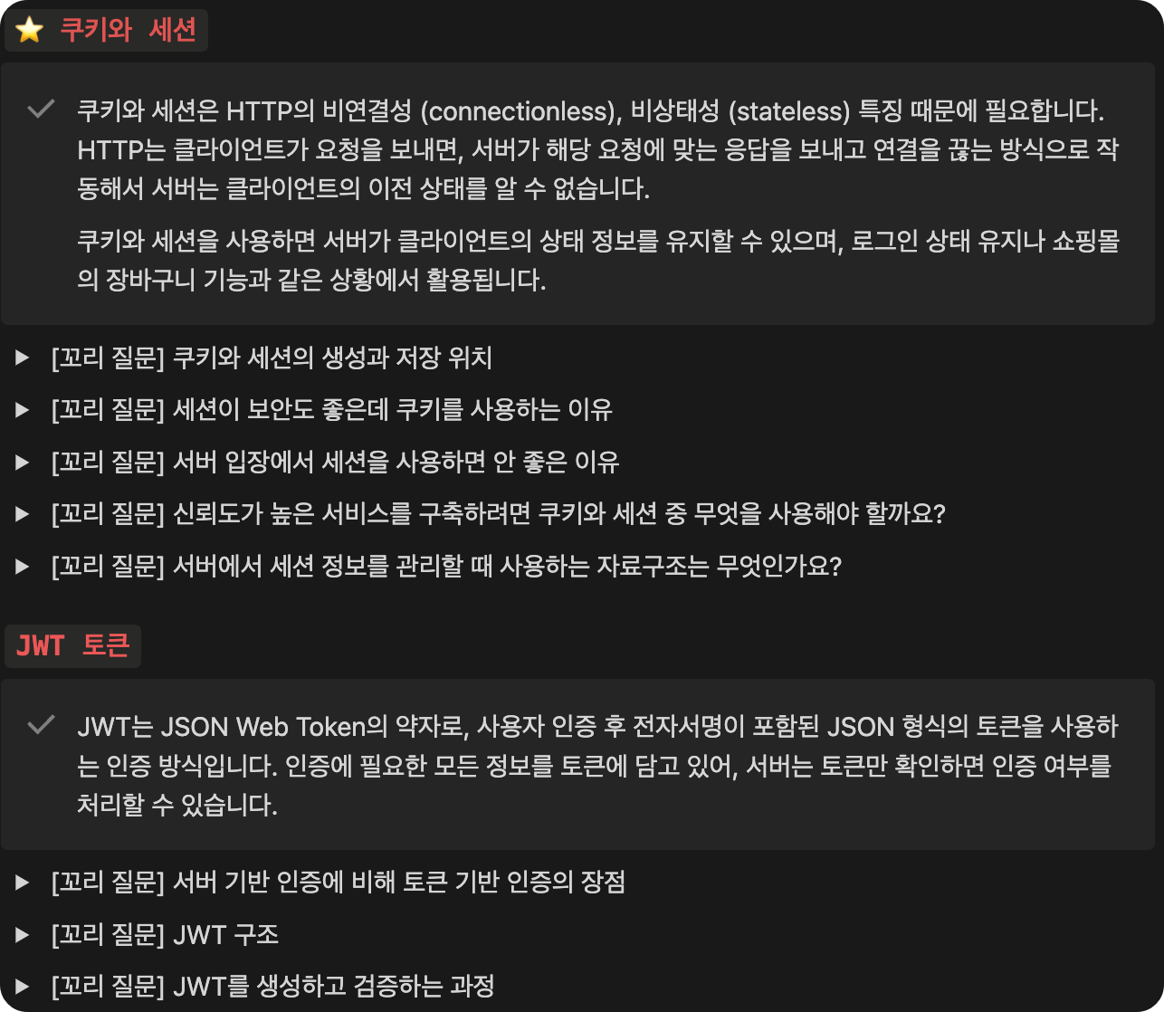매주 스터디마다 제공된 질문들이 존재했지만, 만족하지 않고 해당 챕터에서 나올 만한 질문 전부를 꼬리질문으로 대비를 하였다. 이는 스터디 발표 때 빛을 발했고 칭찬을 아주 많이 받은 부분이 되었다. 뿌 - 듯