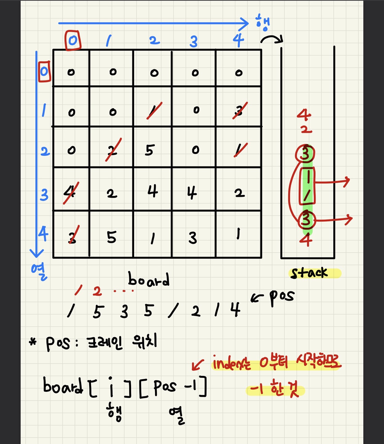 게임 화면의 격자의 상태가 담긴 2차원 배열 board와 인형을 집기 위해 크레인을 작동시킨 위치가 담긴 배열 moves가 매개변수로 주어질 때,