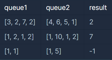 길이가 같은 두 개의 큐를 나타내는 정수 배열 queue1, queue2가 매개변수로 주어집니다. 각 큐의 원소 합을 같게 만들기 위해 필요한 작업의 최소 횟수를 return 하도록 solution 함수를 완성해주세요. 단, 어떤 방법으로도 각 큐의 원소 합을 같게 만들 수 없는 경우, -1을 return 해주세요.